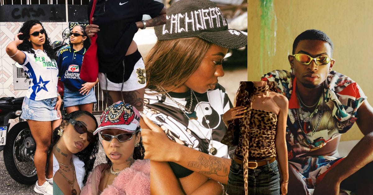 muito além disso, não somente existe o fubanga core que é inspirado nos anos 2000, mas também a moda mandrake. essa estética é a cara da periferia, me refiro a camisas de time, boné de crochê, tênis esportivo e óculos espelhado. a popularização desse estilo foi consequência dos bailes de favela que são momentos de troca e performance, ou seja, uma sociabilidade pros jovens. cantores que vieram das favelas como o mc hariel e tasha&tracie, possuem um grande peso para divulgar o trampo dos criadores da favela.